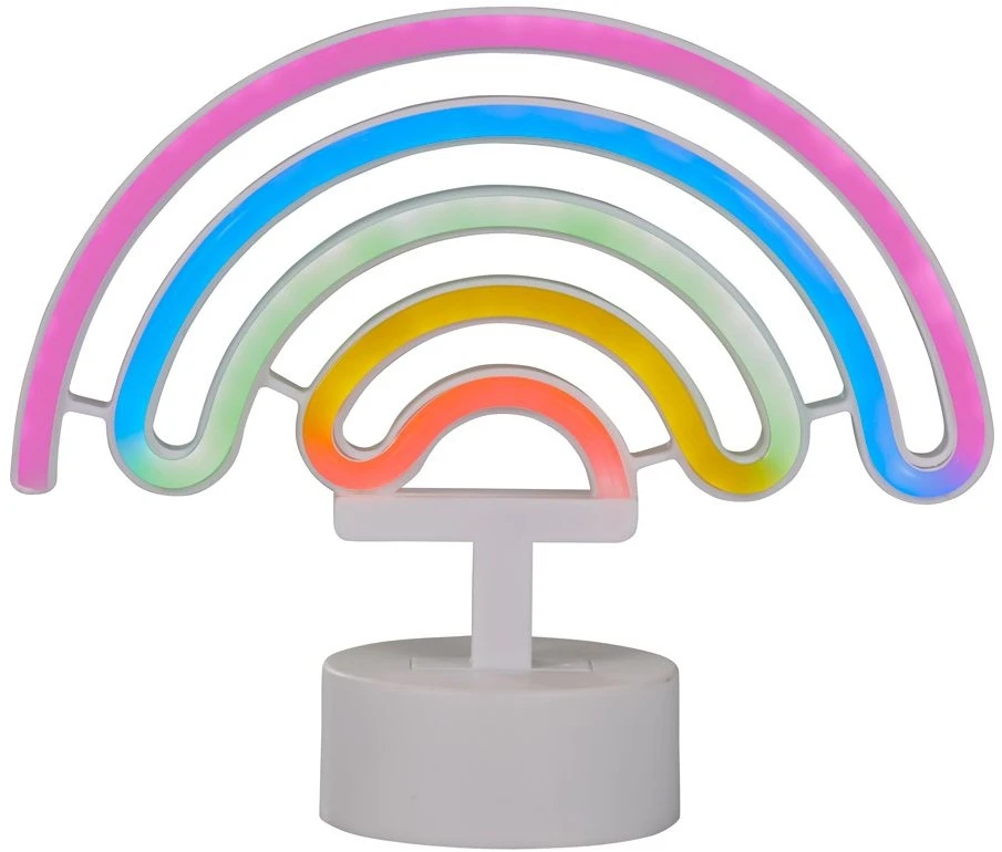 This fun Rainbow Neon Table Lamp will be a real feature in you child’s bedroom or playroom. It features a fluorescent multicoloured design and is battery operated.Â