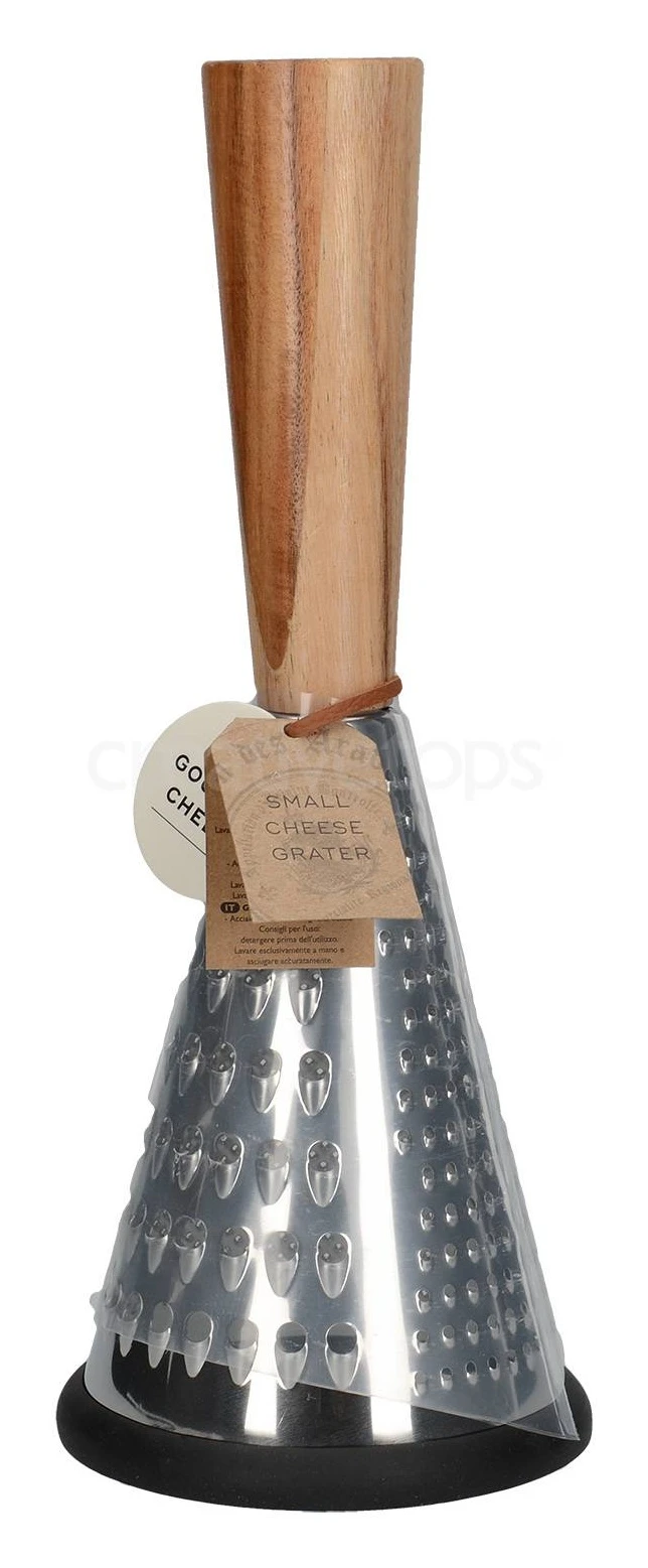 This small cheese grater is from the expertly-crafted Gourmet Cheese collection. Perfect for adding a sprinkle of delicious cheese to meals at the dining table, this free-standing grater has quality rustic style. The stainless steel small and large blades are combined with an acacia wood handle to add a natural touch to dining. The top of the handle is stamped with the Gourmet Cheese logo to finish this beautiful quality piece.