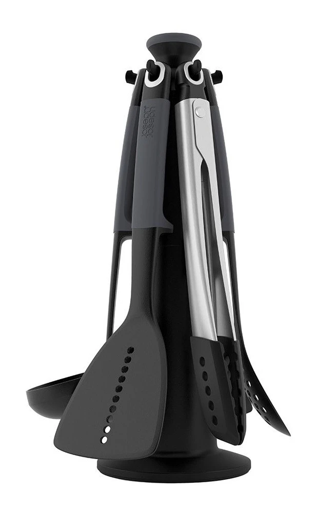 - Set comprises: solid spoon, slotted spoon, flexible turner, slotted turner, ladle, spaghetti server and rotating storage stand.