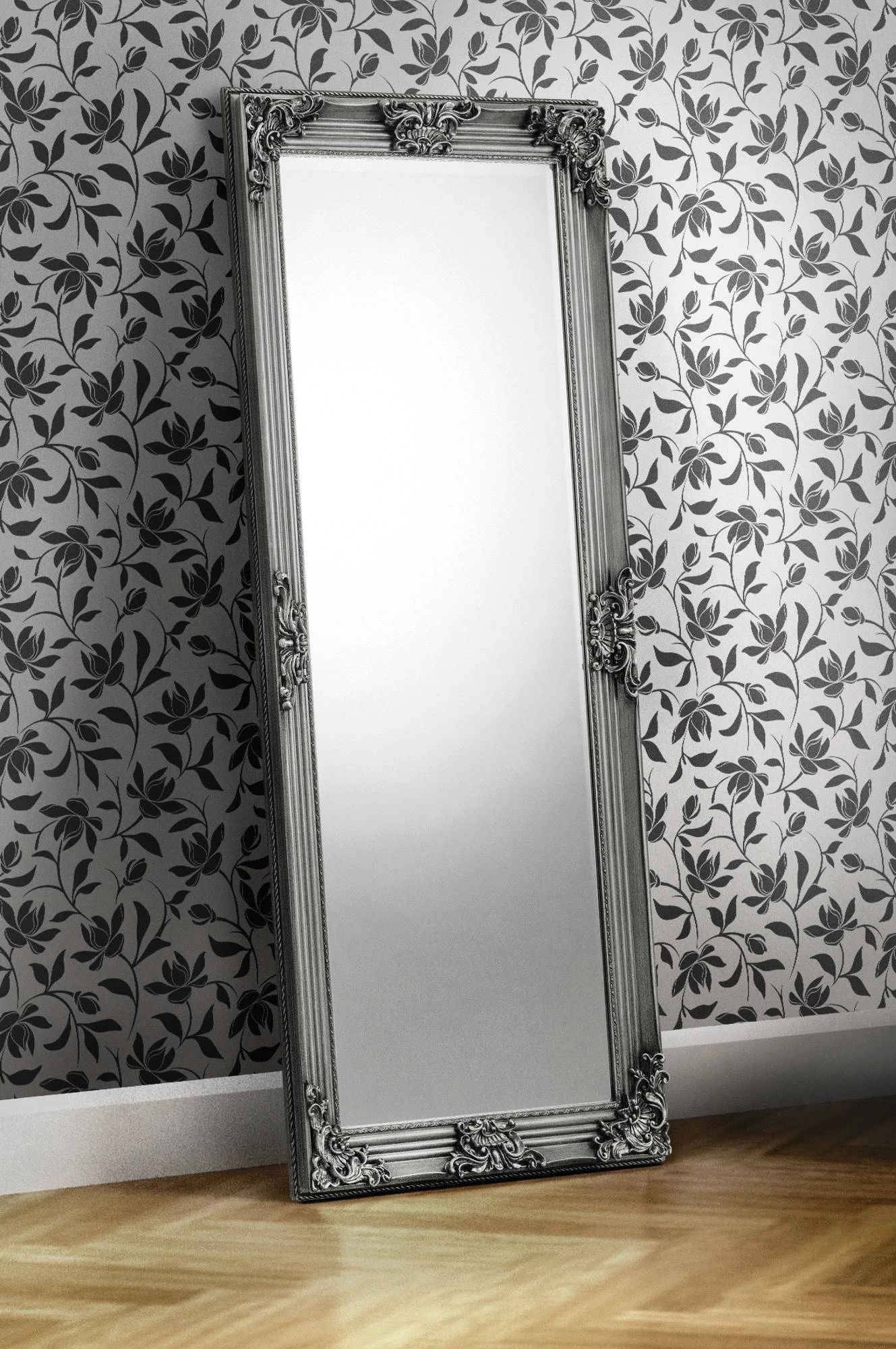 The Rococo lean-to dress mirror is a contemporary take on a classic design. Featuring high quality bevelled edges with antique effect detailing in a pewter effect finish, suitable for a wide range of decor. Crafted from a hardwood frame with resin moulding, this mirror can be anchored to the wall for safety, ensuring long lasting durability.