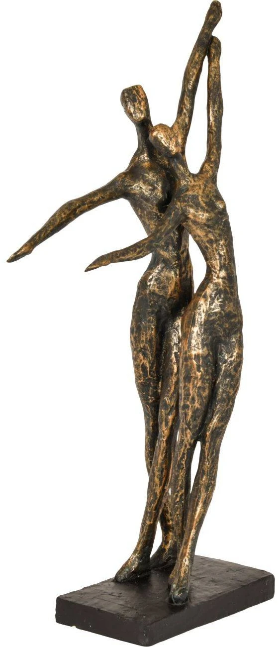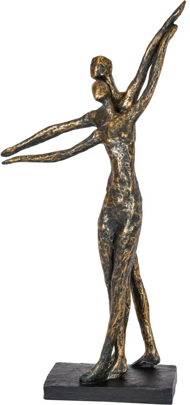 Cast in bronze resin, this sculpture depicts a couple in a celebratory dance pose.