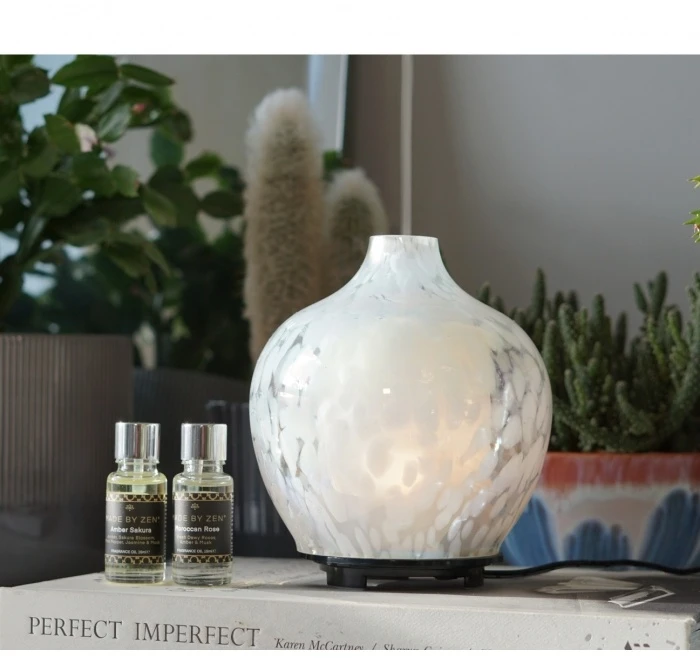 Experience serenity in style with the pearlescent Mercura White Aroma Diffuser, hand blown with a mottled glass dome. The high shine gives a beautiful iridescent glow in the home.
