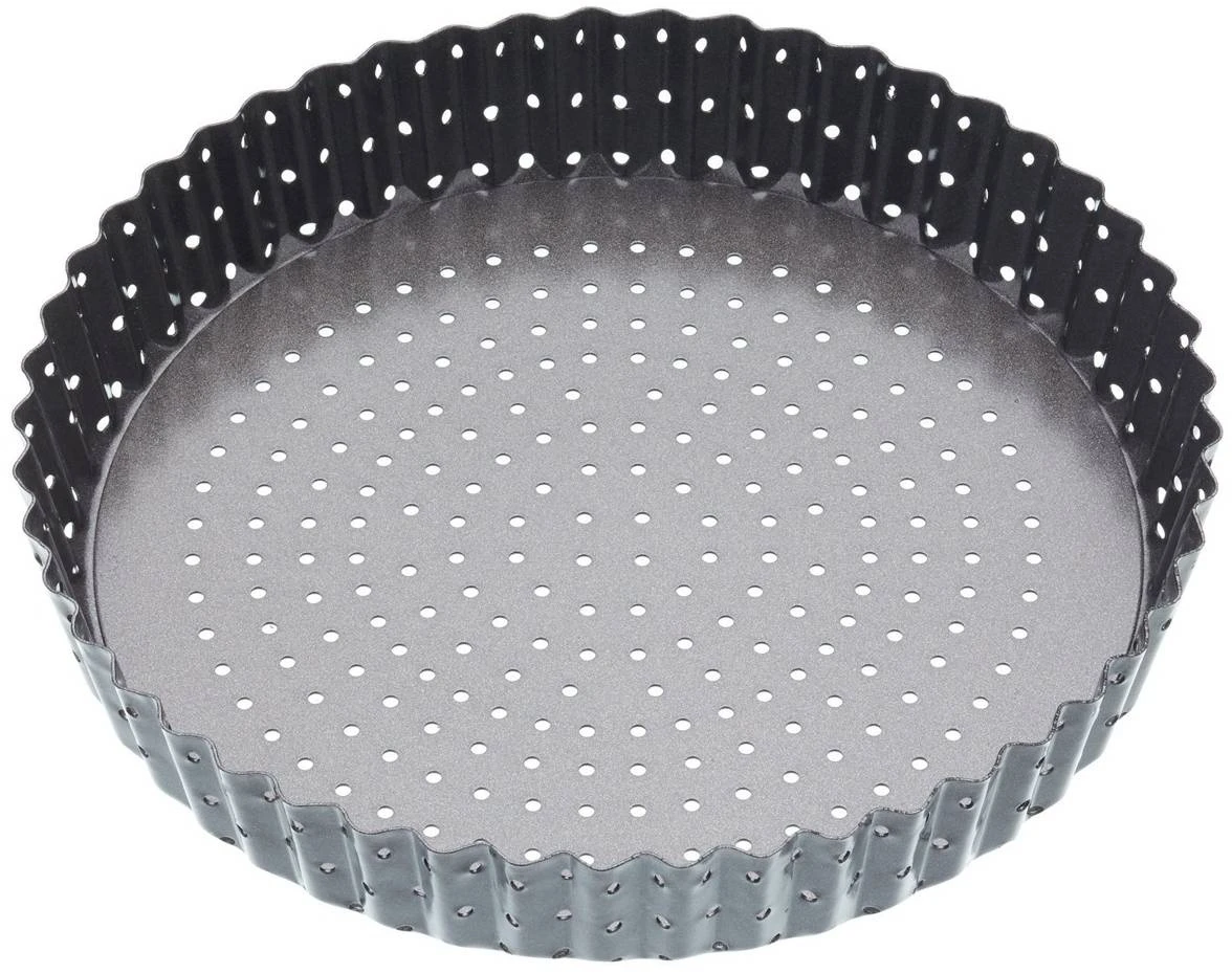 Make delicious quiches, flans and tarts with this non-stick, loose base, fluted round quiche tin. The perforated holes along the base and sides ensure the air circulates freely during the cooking process and you can create fruit flans and savoury quiches with the perfect golden-brown, crisp crust. Let’s banish the soggy bottom forever! Various sizes available.