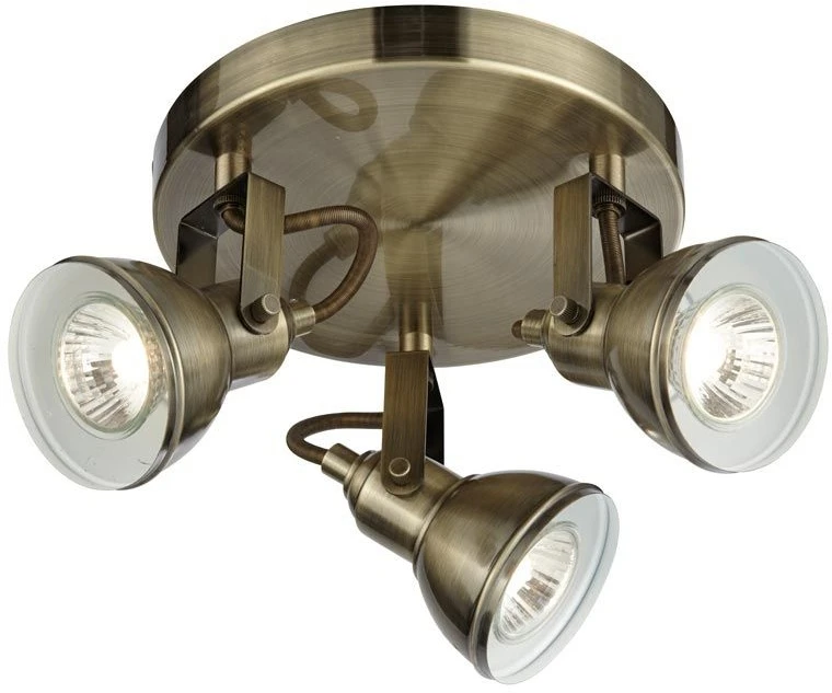 The modern fitting has three adjustable spotlights, mounted on a round plate, and a classic antique brass finish.